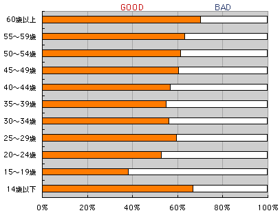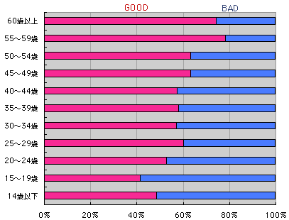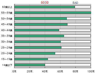 年代が上がるにつれ、GOODの割合が増えています。 男女別にみてみると、世代が上がるにつれて イメージが変わるのは、男性の方が多いようです。