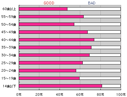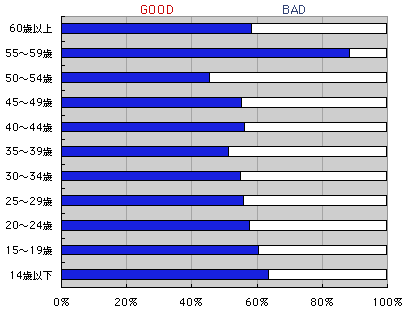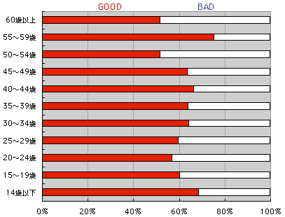メールを紹介します。 ■■■■■■■■■■■■■■■■■■■■■■■■■■■■■■■■ 紅白歌合戦、GOODです。大好きです。 CMなしで、こんなに豪華メンバーの 歌番組を見られるなんて、年に一度の大チャンスです。 出場者や審査員や合い間の応援合戦などで その年の世相を振り返ることができます。 歌詞の字幕が出ますから一緒にうたったっていいし、 どうしても見たくない歌手の出番だったら、 主婦には年末の仕事はいくらでも残っています。 ちょこちょこっとかたづけます。 以前、大晦日の夕食と年越しそばを 別々に用意していた時は 落ち着いて見るどころではありませんでした。 ここ数年、大晦日の夕食は天ぷらそばだけと決めてから 結構、やわらかな気持ちで TV画面を注視できるようになりました。 (すう・兵庫県・50代) BADに入れてしまいました。 結婚して○十年、暮れ正月は主人の実家です。 もうずっとろくに見ていません。 台所の手伝いやらで大忙し。 たまに自分の家で迎えられても、 それはそれでやはり、 仕事があってゆっくり楽しめません。 つまんないです。 それに飽きちゃいましたし 今さら、男と女とで歌合戦、てのも なんか、時代にそぐわないんじゃないのかしら 普段から派手なお祭り騒ぎの番組が多くて 食傷ぎみのせいでしょうか。 演歌も少ないですしね (ほとんど主婦・東京都・50歳) 年末と言えば紅白! 同時間帯、他のチャンネルで 何を放映しているかも知りません。 受験のための正月合宿でも休憩のたびに戻ってきて とぎれとぎれにしっかり鑑賞。 なんだか「年末の課題」のように 毎年しっかり見ています。 ですが、BADに入れさせてもらいました。 理由は 「紅白が生番組である必要性が分からない」からです。 「この瞬間を共有しよう!」とか そういう雰囲気が大事なのかも知れませんが‥‥。 司会役のぎこちなさを初めとして、 何より「ギャグがウケない」ことが問題だと思います。 歌手が、笑わすのを目的としたセリフを喋っても ゲストで芸人さんが登場しても、いまいち寒い。 観客席もノッてこない。 節目であるべき年末なのに「ふー‥‥」と ため息が出てしまいます。 テレビの前ですごくいたたまれない気持になります。 なんだか大お遊戯会のようで‥‥。 生にこだわらず、きちんと前もって撮っておけば‥‥。 それがダメでも,笑い屋を雇えば‥‥ と、余計なことを気にしてしまいます。 今年は曲順はヒミツだそうで、2時間だったっけ、 全部通して見なければいけないみたいで、 いつフロに入ればいいのかすら分からず‥‥。 ますますBAD感は募ってしまうのです。 (新潟県・女性・20歳) 紅白! 毎年すごく楽しみなのです。 Good! Goooood! 「見るぞう!」っと何日も前から テンションを上げてゆくんです。 いまからワクワクしてますよ。 なぜかはわからない‥‥。 一人で見るのは寂しいので (つっこみを発声するので誰かに聴いて欲しい) 必ず誰かと見ます。たいがい嫌がられます。 子供の頃から、家族みんなと見てた影響かなぁ。 わたしが子供の頃はまだいまよりも 「年末年始」がすごい非日常だったんですよ。 その中で「紅白」は年末年始の「年末」部の クライマックスだったんです。 最近では最後の「蛍の光」のところで なぜか涙ぐんだりしちゃうんです。 (うどん子・東京都・女性・34歳) 昭和33年大晦日の紅白歌合戦。 小学3年生の私は急性腎炎で入院中のため、 見られませんでした。 安静第一ということで医者の許可がおりず、 皆は階下の待合室のテレビを見に行ったのに、 私は病室のベッドの中でラジオを聞きながら 布団かぶって泣いていました。 娯楽の少ない当時、紅白は、 見られない子どもが泣くくらい華やかで わくわくするような楽しみだったのに、 今は昔日の面影なし。 歌以外の過度の演出がぞっとして、 年々見る気がなくなります。 歌だけ聞かせてくれればいいのに。 そもそももう紅白でも合戦でもないだろうに、 NHKはいつまでこのままの路線を 続けるつもりなんだろう。 たぶん今年も途中で見るのをやめて寝るでしょう。 泣きながら聞いていた、ラジオから流れてきた 紅白入場行進の音楽が嘘みたい、 ということで今はBADイメージです。 (埼玉県・女性・53歳) こころの中で小さく、goodが沸いてきました。 結婚してから14年、年末や選挙の日には 必ず映画のビデオを観る夫。 紅白は小さい頃の、 家族でまじめに年末年始を過ごした こどもながらの切り替えの一つでした。 母が台所でおせち料理、 こどもたちはぎりぎりまで掃除に励んで、 カレンダーを取替え、お風呂に入ってTVの前に。 家計は豊かではなかったけれど、 家族で迎える新しい年は、 賑やかな画面とピンとした家の中が セットになってうれしかったようです。 書いていたら我が家のこどもたちにも プレゼントしたくなりました。 今年は掃除と料理がんばってみます。 (東京・女性・40代) なんたって、長すぎ。 この番組を初めから終わりまできっちり見て