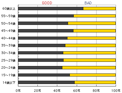 年齢別では次のとおりです。 20代から30代はGOODが少なくなっています。