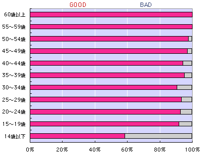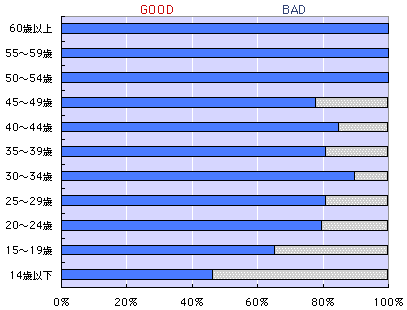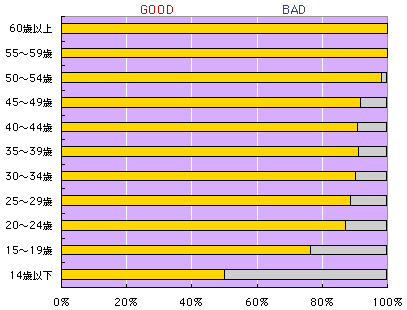 年齢別に見ると、みごとに、弧を描くようにして GOOD率が年齢とともに上がっています。