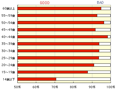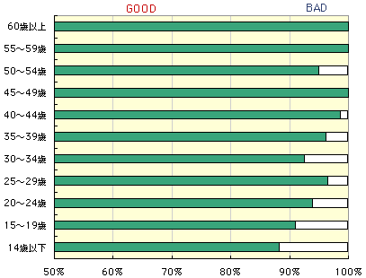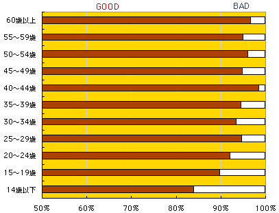 年代別、かつ性別でもやはり、年配の人の方が GOODの割合が高くなっています。