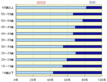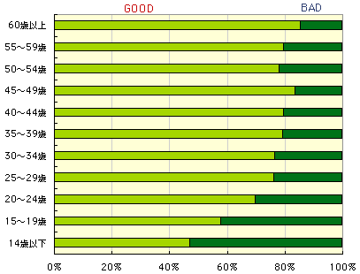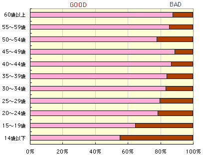 年齢別にみると、大きな差がありました。 後ほど紹介するメールにもありましたとおり、 子供の時はBADだった、というのがよくわかります。