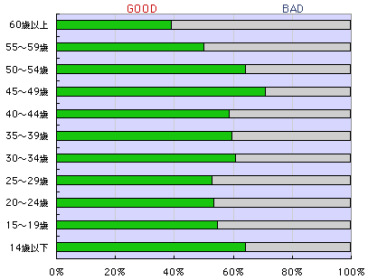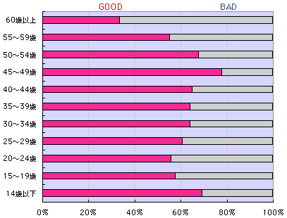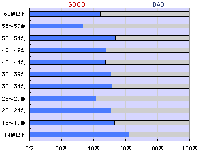 性別のGOODorBADでは、 たぶんみなさんの予想どおり、 女性の方がGOOD優勢です。