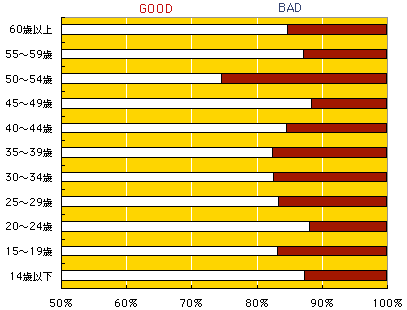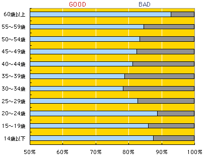 年齢別にみると、女性はばらばらのようです。 男性は、30〜40歳代に比較的BADが多くなっています。