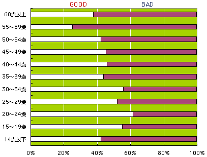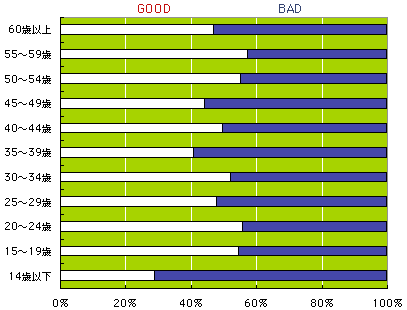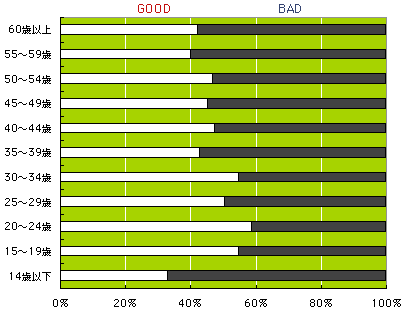 しかし、性別兼年代別に見ると、 女性の方が世代による差は はっきりしていることがわかりました。 30代まではおおむねGOODイメージですが、 それ以降はBADイメージが優勢になっています。 男性は、20代と50代にGOODの時期があるようです。