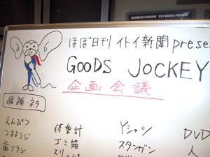 プロ野球の日本シリーズがはじまりましたね。 GOODS JOCKEYの時間帯に プロ野球中継が続いている場合、 ラジオでの放送は中止となり、 TBSラジオ内のホームページだけで 放送されることになります。 そんな変則的な1週間だからこそ、 普段は聴くことができない GOODS JOCKEYの企画会議を放送してしまいます! 番組を3週間やってきてだんだん見えてきた GOODS JOCKEYの根幹をささえる 「モノ」の話だけではありません。 アシスタント柳井さんの反応のムラがあばかれたり、 収録をより楽しくするためにはどうするか、 これから取り上げたいモノや、 お蔵入りになってしまったモノのことも。 ![]() 日本シリーズが21時までに終了すればラジオで、 21時過ぎまで中継が続いた場合は インターネットで聴いてみてください。 「私のとっておきのモノもとりあげて!」 「私はこのモノのここがいち押し!」などなど 企画会議に参加する気分で、 ご意見を[email protected]まで送ってくださいね。 放送内容は放送予定日の22時ごろから TBSラジオ内のホームページから 聴くことができます。