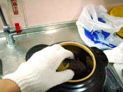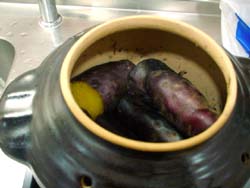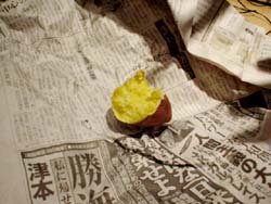 先週とりあげられた「焼きいも土鍋」を 使ってつくられたホッカホッカの焼きいも。 あま〜い香りとおいしいとの噂を聞きつけて GOODS JOCKEYスタッフ以外も TBSラジオのフロアにいた人々が スタジオに集まってしまったほどでした。 今週はこのおいしい焼きいもの作り方を 「ほぼ日」上でおさらいしておきます! 【焼きいも土鍋で作る焼きいも】 1サツマイモを半分ぐらいに切ります。 (小さめにしたほうが早くできますよ) ![]() 2やきいも土鍋にいれて中火にかけます。 ![]() 3軍手をつけた手もしくはトングをつかって、 5〜8分毎にサツマイモをの 場所や向きを動かします。 ![]() 4外側に焦げ目が軽くついたら弱火にして、 まわりがこんがり、中がホクホクするまで 30分〜40分ほど場所を動かしながら 焼き続けます。 (サツマイモの大きさによって時間は 前後しますので、竹串をさして、 焼け具合をチェックしてください) 【ポイント】 はじっこを焦がすとおいしいですよ! ![]() 5濃いめの塩水を用意して、できあがった 焼きいもをジャブッとつけます。 ![]() 6できあがり〜。 ![]() さて、30分〜40分も待てない! 早く食べたいという方には ちょっと甘味とホクホク度は落ちますが、 電子レンジでつくる焼きいもの作り方も まとめておきましょう。 【電子レンジで作る焼きいも】 1サツマイモを切ります。 ![]() 2サツマイモに軽く水をかけます。 ![]() 3新聞紙でくるみます。 ![]() 4電子レンジに12分ほどいれます。 (サツマイモの大きさによって時間は 前後しますので、調整してください) 【ご注意ください】 電子レンジにいれる時間が長すぎると サツマイモがしなびてしまいます。 ![]() 5できあがり〜。 ![]() 放送を聴いた埼玉県のパピコンさんから こんなメールもいただきました。