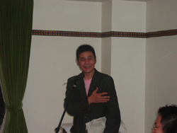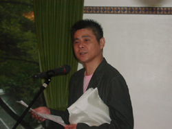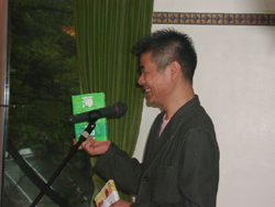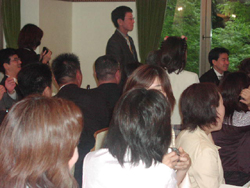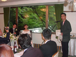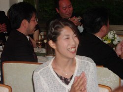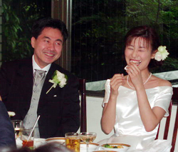 3ヶ月前、今年結婚のご予定のあるカップルから 「新しい家庭では、こんなおもてなしをしたい」 というメールを募集しました。 当選されたかたには、 GUEST&MEを招待客の人数分プレゼントし、 さらには生darlingのスピーチ付き! という企画を行いました。 そのプレゼントに当選された 健太郎さんと葉子さんをお祝いすべく、 darlingが、6月15日(土)、 披露宴会場である、 東京、御茶ノ水の「山の上ホテル」に行ってきました。 ここです。 今回のGUEST&MEは、 この披露宴当日の模様を、 darlingに密着してルポいたします。 担当は、通天閣あかりです。 よろしゅうたのんます。 皆さま、「山の上ホテル」ご存知でしょうか。 大変しっとりとした趣味のよいホテルで、 従業員の方々の笑顔も心地よく、 都会の真ん中にあるのに、ほどよく静かで、 ああ、大都会東京にも、こんなホテルがあったんだなあと 大阪出身のわたくし感動いたしました。 おもてなしの心、ここにも発見です。 なんでも、直木賞作家や芥川賞作家が 「缶詰め」になることでも有名なホテルらしいです。 そんな場を夫婦の出発点に選ばれたお2人も さぞかし、と思っていましたら、 想像通り、しっとり落ち着かれていて、 とても親切なお2人でした! 健太郎さん&葉子さん 結婚式を終えられて、披露宴へ向かわれる前の お2人へのインタビュー、 もうちょっとマシな質問をしたかったのですが 出てきた言葉は 「今のお気持ちは?」 新郎の健太郎さんは、開口一番、 「本当に正直に今の気持ちを言っていいですか。 今日の披露宴に出る中華料理は、 お客様に喜んでもらえるように すごく美味しいメニューを 用意させてもらったんです!」 まずまっ先に、お客様のことを考える健太郎さん、 流石、この商品を引き出物に、 と思われただけありますね! 「その料理が、僕もとても楽しみなんですよ! 今日の目標は『完食』ですね。(笑)」 って、あれあれ。正直なおかた・・・。 どうやら、緊張などは一切されていないご様子です。 頼もしい! でも、本当は、はやる気持ちをおさえるための ちょっとした照れ隠しだったのではないかなと 通天閣、お察しいたします。 新婦の葉子さんのほうは、 「いい意味で、普段通りの気持ちで式を行えましたので、 ほんとによかったです。」 とつつましやかで、素敵でした。綺麗でした。 私も聞かれたら、こう答えよう。メモメモ。 いい笑顔。 招待客の皆さまには、 darlingが来ることは、秘密にしてあるということで 到着したdarlingも出番前の芸人さんのように ちょっと緊張気味。 「なにしろ、会ったことがない人の披露宴だもんなあ! 不思議な感じだ。」 確かに。 健太郎さんもNHKの「YOU」の頃から darlingのファンだったということで、 そんなdarlingが、 ご自分の人生のすごく大事な場に登場するというのは 不思議なものでしょうね。 司会のかたが 「生コマーシャル」のように ほぼ日刊イトイ新聞のことや、 GUEST&MEの紹介をしてくださり、 いよいよdarling登場です。 「そんなこんなで、 今日はこの会場に糸井重里さんご本人に 来ていただいています!どうぞ!」 という掛け声と同時に、 観音開きのドアが、ばばーんと開き、 darling登場ーっ。 初めまして。糸井です。 客席は「きゃー」と賑わって、フラッシュばしゃばしゃ。 ベッカムのシュート時さながらです! 騒然。 「おめでとうございます!(笑) どういう立場をとっていいかよくわからないんですけど 会ってない人の結婚式って初めてで、 (会場笑) 今日の中華料理を完食することが 新しい夫婦の最初の目標です、とおっしゃっていた、 という話はさっき聞いたんですが。 (会場笑) いや〜本当に今日はおめでとうございます!」 おめでとう! 「応募メールをみんなで読んで、 関係者が、満場一致で、 このカップルに引き出物プレゼントをさしあげたい、 ということになりました。 そのメールが本当に良かったんです。 ここでご紹介しましょう。 焼き肉の話から始まりますが。(笑)」 「この当選が決まった後、何も知らないままに、 ここに立つのも失礼だなと思いまして、 改めてお2人についてのメールをもらったんですが、 そこに書いてあることも 食い物のことばっかりでした! (会場笑) さんまを焼いて集まっただとか。 これは生物として間違いない と思いました。(笑)」 「会ってないのに祝うというのも妙なものですが、 万事、縁のものですから、ね。 お2人が同じ会社に入られたことも縁ですし。 何かの間違いで、人と人とは会い、 その間違いから何か新しい芽が育っていって 新しいナイスな間違いをやっていくんだと思います。 後ろの新緑も美しく。金屏風はいらない。 縁の中に飛び込んでいこうというのが 危なっかしいけれども面白いし、 自分たちの生き方が、豊かに変化していく きっかけになると思いますので、 縁を大切にしたいです。 またメールくださいね。」 そしてスピーチ終了後、 「宣伝の意味はないです。本当です。 宣伝のときは宣伝といいます。