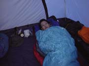 さっそく寝袋にも入って、寝心地など確認。