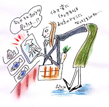 「イカ」はうまい!! これほどまでにメニューの豊富な食材が 他に存在するだろうか? 「刺身」「煮付け」「バター焼き」「イカ天」 「イカ飯」「リング揚げ」「姿焼き」 「イカ」単品でもこれだけのメニュー。 その他は「シーフードカレー」「シーフードピラフ」 「シーフードサラダ」などなど。 乾き物としても数種類あり、 私たちの生活を豊かにしてくれています。 特に「イカ飯」なんて「イカ」がまんま「容器」ですよ!! 「イカとっくり」のように「風味だけ目当て」で 「イカ」を使う贅沢なものもあります。 そう!「イカ」はシーフード界の陰の王者なのです!! 確かに、派手さは欠けるかもしれません。 「たい」「ひらめ」のように「龍宮城」で「舞踊り」だって そりゃあ、しやしませんよ!! でも、「たい」や「ひらめ」は人間界で言えば「タレント」。 所詮イベントでしかないのです。 どんなに、ちやほやされても、いざとなったら みんな「イカ」のような親しみやすい 「庶民的」な人を選ぶものです。 そんな「イカ」の魅力を裏付けるように 昔から日本語の中にたくさんの「イカ」が隠されています。 これは私の独自の考えですが、まあ、いつもそうですが、 「イカす」「イカれる」「イカがですか」 「イカがなものか」「イカないであなた」など。 ほら、こんなに私たちは「イカ」を連発していたのです。 そして、誰もが気にする 「タコ」との決着に関する問題ですが、 これも今日ここで解決したいと思います。 まず、「姿」。 「タコ」は丸に足八本。 「イカ」は三角に四角に足十本。 造形的な量の多さと足の数の多さにより審査。 「イカ」の勝ち。 メニューの幅の広さでは 「タコの刺身」「タコ天」「タコ焼き」「煮付け」 ほら、もう詰まった。 「タコ飯」って言ったって「タコ」が刻んで入ってる 炊き込み御飯でしょ!! 「イカ飯」ほどのインパクトは残念ながらありません。 「イカ」も「タコ」ももっとメニューはあるでしょうが パッとでてくる数がもう、遥かに違うでしょ!! 「タコ」に勝つことと「イカ」が素晴らしいことは 全く関係のないことではありますが、 この因縁の決着に関して触れないのは クリームソーダを出してストローを出さないような ものなのですからしょうがありません。 ようするに「セット」ということです。 「イカ」の素晴らしさ、お分かりいただけましたか? こんなに素晴らしい「イカ」。 「タコ」のようにもっと愛着あるキャラにしていく 必要があります。 「タコのはっちゃん」って、 別にキャラクター商品じゃないけどなんとなく 「頭にハチマキ」して「うちわ」持ってるという 万人に共通のイメージがあるでしょ!! 「イカ」もそろそろ、そういうのが必要な時期に 来ていると思います。 白い肌にスマートなスタイルから 「シルクハット」に「ステッキ」で 「イカのセルジュ」とか。 「セルジュ」の「ジュ」は もちろん「十」の「ジュ」という意味。 こんなにお世話になっている「イカ」ですもの!! この「イカのセルジュ」を流行らせましょう!! 今日から魚屋で「イカください」というのを 「セルジュ」ください。と言ってください!! 全国の「お魚屋」さんの力を借りて 「おさかな天国」の時みたいに 「セルジュ」ブームを私たちの手で作りましょう!! 来年の「流行語大賞」を目指して!! さあ、今日から忙しいですよ!! レッツ!! ビギン!!(BY 村野武範)