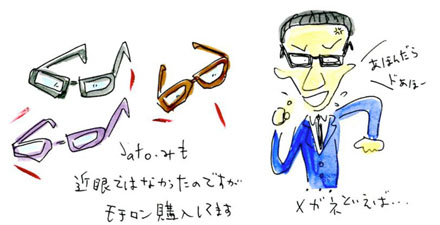 実はわたし、すっごく「目」が悪いの。 「左0.02」「右0.1」 左右の差が驚異的!! ここまで左右の視力に差があると めがねを作る時、レンズの厚みに 大きく違いが出てしまうので 「見た目に許せる範囲」で度数を抑えて わたしのめがねは作ってもらっています。 だから、正直「見え方」はいまひとつ。 めがねのフレームもなるべくオシャレなものに してるんだけど、分厚いレンズだとどうしても 目がちっちゃくなって、かわいくないのよね。 デザイン以前の問題よ。 ひみつのアッコちゃんの「チカちゃん」 みたいになるでしょ? わかる? で、コンタクトレンズも作っているわけ。 こっちだと、「分厚さ」を気にせず かなり「度」を上げることが出来ます。 だから、コンタクトのときはよ〜〜く見えるの!! コンタクトを初めて使ったのは高校生の時。 その時の衝撃は今でもよーく憶えています! 「こんなに、モノってはっきりした形と色だったんだ!!」 って、びっくりしたんだから!! 横断歩道の向う側で待ってる人の表情まで はっきり見えるし 会話してる人の肌の毛穴まで見える!! で、わたしはちょっと外に出るのが辛くなったの〜。 だって、「見え過ぎ」よ〜〜!! 「見え過ぎちゃって困るの」。 もちろん、すぐに慣れましたけど。 でね、最近は家にいる時はずっと「めがね」なの。 でも、「お出かけ」のときは「コンタクト」。 やっぱ、よく見えるんだーー、これが! で、いつもショックなことがあります。 それは家の中の「汚れ」!! 毎日、ちゃんとお掃除してるつもりなのに コンタクトにした途端、あちこちの汚れが すごくよく見えちゃって‥‥。 「うわ〜〜、ここすごい汚れてる!!」と 思うんだけど、なにせ「お出かけ」前なわけだから すぐに掃除に取り掛かれないのよねー。 だから、毎度毎度、この繰り返し。 で、家族を見ると、子どもが思っていたより 大きいのよーー。 「うわー、あんた、こんなに太ってたの?」 みたいな感じ。 2匹の犬もひとまわり大きく見えるから 「こりゃあ、えさ、やりすぎだよ!」 とか。 わたしが思ってたことと「真実」の間に 信じられないような「ギャップ」があるの!! もちろん、「いつまでもステキなダーリン♪」って 思ってた旦那も「うわー、おじさんじゃん!」 だし、 「いつまでもかわいい、あたし♪」 だって 「げー、おばちゃんじゃん!」 なわけよ。 ようするに「霧が晴れた」ってやつ。 で、またしても世紀の大発見。 これさー、わたしの視力があと0.1良ければ 今のわたしはいなかったね。 「感じ方」とか「生き方」として。 ようするに「クレオパトラ」の気持ちがわかったわけよ。 「私の鼻があと1センチ低かったら世界は変わっていた」 とかなんとか、言ったでしょ? あの人。 それで 「あと10センチ背が高ければ人生は変わってた」って よく言うけど、でも「視力」が一番言えてます、絶対。 世の中、みんな同じものが見えてるわけじゃないね。 もちろん「心」で見るものはひとりひとり当然違うけど そうじゃなくて固体。 例えば、同じ「イカ」を見ても ひとりひとり「イカ」の色も形も 微妙に違って見えてるってこと。 だから、世の中はうまくいってるのよ!! そりゃ、「見たい」時期もあった。確かに。 でも、今のわたしは「近眼っていいじゃん」って 思うようになったの。 「見えればいいってもんじゃないのよ!!」 「リアルに生きる」だけが人生じゃない!! 大江千里さんの言ってることも もちろん正しいけど どこか「リアルに生きれない」宿命の 「近眼」さんがいてこそ、世の中に 「不思議ゾーン」というのが生まれるのです!! まさに「トワイライトゾーン」!! これって、けっこう重要でしょ? 世界に「深み」が増すでしょ? さあ、「近眼」さん! もっと自分に自信を持ちましょう!! ちょっと見間違えてるくらいがちょうどいいのよ! 自分に都合よく生きていきましょう!! 「本当は違うのかしら?」なんてビクビクする必要は もう、ないのよ!! 大きな顔で「人違い」や「読み間違い」をして 生きて行こうではありませんか!! 「近眼」さんというのは 「そこにないものを見る」という特殊な能力が 備わってるということなのですから!! その上、「近眼」さんは 「よくわからない」ことに慣れてるから 「まあ、いいや」の精神が育まれています。 筋金入りの「楽天家」なのよ! 悪口だって聞こえなかったらいいじゃない? それと同じで 見えてなかったら気にならないの! 見えてる人には信じられないだろうけど 見えないわたしには関係ないのさ! これって、実は「能力」よ! こりゃあ、「プリンプリン物語」の 「火星人」くらいすごいですよ! 「ルルルルル! 予感がします」って耳を回すのと 同じレベルだって、言ってるのよ!! 嬉しいでしょ! 「近眼」さんは「目が澄んでる」ともいいますし めがねで「チカちゃん」になってたって 外せば、「アッコちゃん」なんだからさ! このギャップが素晴らしいのよ!! これを「テクマクマヤコン」と言います! うちは夫婦