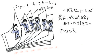 ●●●●●●●●●●●●●●●●●●●●●●●● とかく、「だじゃれ」をテーマにしたコラムは、 「だじゃれ」がテーマであることをいいことに、 必要以上に「だじゃれ」を 文中に織りこむきらいがありますが、 その点、フランソワーズさんは 奥ゆかしくてさすがです。 わかってらっしゃいます。 それよりもむしろ、予想外の 「早口ことば」に度肝を抜かれましたが。 小学校5年生のときにあれをつくったことよりも、 小学校5年生のときにつくった 早口ことばを覚えている ということのほうに驚きを覚えました。 さあ、次回はどんなテーマでしょうか? イラスト:さとうみどり |