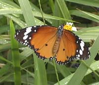 | その27 目立つが勝ちという生存戦略 今回は毒について考えてみたいのです。 ハブやサソリは毒を持っています。 毒で餌になる動物を麻痺させたり、 外敵に襲われたときに身を守ったりするわけです。 いわば攻撃的な用途であり、 そのために毒を仕込んだ牙や針を持っています。 ここまではわかる。 問題は毒チョウなど体内に毒を持つ生き物です。 彼らは自ら攻撃するわけでもないのに 体内に毒を隠し持っています。 それにどんな意味があるのでしょうか。 具体的な例をあげて考えてみましょう。 奄美以南にはマダラチョウの仲間の カバマダラというチョウが住んでいます。 オレンジ色の翅とその先端の黒白の模様が鮮やかです。 毒チョウのカバマダラはよく目立つ このチョウの食草はトウワタなどのガガイモ科の植物。 ガガイモ科の植物は有毒成分を含んでいますが、 カバマダラの幼虫はこれを平気で食べます。 そればかりか毒素を自分の体に貯えていくのです。 そして貯えた毒は成虫になっても残っているのです。 さて、毒の意味の考察に戻りましょう。 チョウの天敵は鳥。 鳥はカバマダラを捕まえても、 食べたとたんにまずくて吐き出してしまいます。 さすがに食べられたチョウは死んでしまうのでしょうが、 食べたほうの鳥は二度とカバマダラを捕まえません。 これにより多くのカバマダラは鳥に食べられないですむ。 チョウの体内の毒は、1個体が犠牲になることによって、 種全体の安定的な繁栄をもたらしているといえる訳です。 ここまで考えてくれば、 カバマダラが派手な色をまとっている理由もわかります。 仲間の犠牲を無駄にしないためにも、 自分も仲間と同じく毒を持っていることを 積極的に天敵にアピールしたほうが得策なのです。 これを警戒色と呼びます。 南米の毒ガエルもそうだし、一部の毒キノコも同じです。 美しいものには毒があるといいますが、 満更でたらめではありません。 警戒色はわざと目立つことで天敵から身を守るという 舌を巻くほど巧みな生存戦略なのです。 しかし上には上がいるもの。 この警戒色を逆手に取って生活している生き物もいます。 その話は次回に。 |