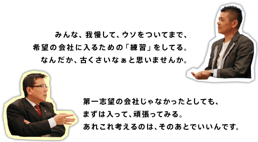 | 金井 | ええ、「御社」だとか 「わたくし」だとかいう言いかたなんて、 ふつうに考えたら、 会社へ入ってから覚えればいいことですよね。 そういうことを練習してること自体、 おかしいことだと思います。 あるいは、 10年後に自分はどうなりたいか、 なんてことを説明する練習をしたりとかね。 |