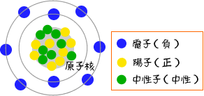 電気の力の話のお次は、原子の話に移りましょう〜。 原子は100ちょっとの種類があります。 周期律表はその原子の種類を並べたものです。 世の中にあるものは、この原子の組み合わせで いろいろなものが作られているのです。 だから、原子は物質の最小単位といわれます。 それではこの原子を拡大して見てみましょう。 ![]() 上図のように 原子は中心に正の電荷を持つ原子核があり その外を負の電子が回っているという かたちをしています。 原子核は、正の電荷を持つ陽子 (と電荷が中性の中性子の)集合体です。 原子は通常、陽子の数と電子の数が同じなので ものすごい力であるはずの電気の力は バランスをとっていられるのです。