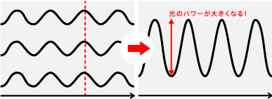 では、レーザーがコヒーレントであることは どんないいことがあるのでしょうか? ふたつの光を重ね合わせると 「干渉」ということが起こります。 つまり光の波の足し算ですね。 ふつうのコヒーレントでない光と コヒーレントなレーザー光を足し算してみましょう。