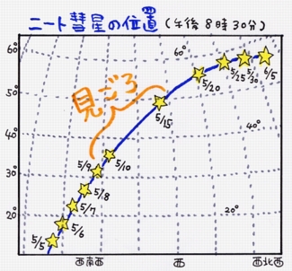 きらきらと、かわいかった。 さて、 ことし最大の天体イベントと言われる ニート彗星の来日。 じつは5月4日ころからもう、 うっすらと見えているはずなのです。 とはいえまだまだ高度が低いので、 障害物の多い場所から見つけるのは かなりむずかしいかもしれません。 見ごろは、5月9〜15日あたり。 条件さえよければ連日見られる可能性も。 ゴールデンウイークからしばらくは、 日が沈んだら西の空を要確認です。 見える位置は、下の図表を参考にしてください。 あ、念のため言いますと、 ほうき星は流れません。 流れ星とは違って、1カ所にとまって見えます。 それと、見えるかどうかはあくまでも はっきりわからない、ということをお忘れなく。 彗星の明るさ予測はとても難しいとか。 まるで見えないこともあれば、 予想よりずっと明るく見える場合もある、 わからないのも、彗星の魅力なんですね。