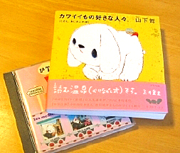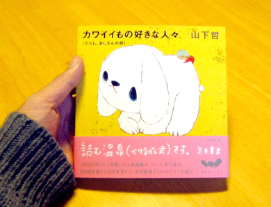 そうです、外見はかわいさの基本。 まずは見た目からまいりましょう。 カバー画は福田利之さん(37)です。 大人気を博した「写真絵はカワイイ」の、 現在「福田のフォト絵」でおなじみの、 あの福田利之さん(既婚)が、 カバー画を描きおろしてくださいました。 おじさんが大きなうさぎにしがみついてます。 福田さんは、フォト絵だけではなく、 こんなにすばらしい絵も描かれるのです。 当コーナーでの出会いが生んだ、 黄色地に白いうさぎの、このカバー画、 たからもの的なかわいさです。