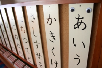 と、ここで見慣れないものを発見。 「ひらがなのおべんきょうボード」 とでもいいますか。 とにかくひとことお願いいたしましょう。 代表で「あ行」のかたどうぞ。