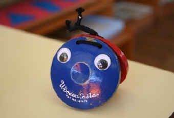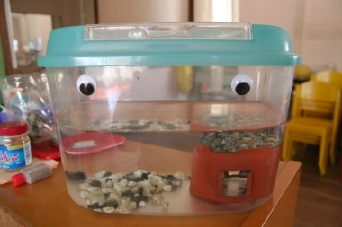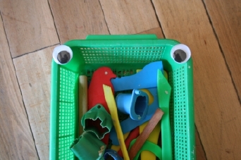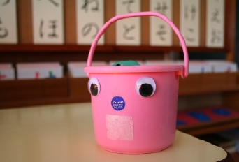 粘土遊びの道具入れに動眼。