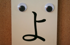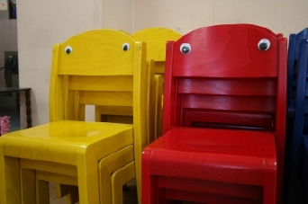 そう、貼るの。 思う存分、貼らせていただきます。 保育士の先生は「では、ご自由に」と 僕を残して職員室へ。 いよいよ男は、ひとりぼっち。 さあ、動眼まつりのはじまりです! まずは、ちいさき椅子たちに動眼。