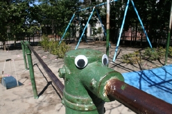 タンバリンなどは瞳をうるませております。 そんな気持ちを代表して、 「ひらがなのおべんきょうボード」から 春休み中のおともだちにメッセージを。 どうぞ‥‥。 それから僕は、 うららかな春の光が降りそそぐ みどり豊かな園庭へと出てみました。 素朴でなつかしい遊具がございます。