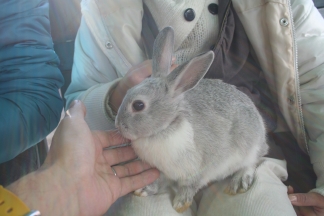 来園者の女の子がひざにのせているうさぎと