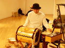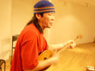 | いよいよ本番直前、 ボロットさんは楽しんでいます! ほぼにちわ。 「アルタイ文化研究会・会長」たんじふみひこです。 普段はアノニマ・スタジオという本のレーベルで 編集者をしてますが 『ボロット・バイルシェフ in JAPAN 2004』コンサートでは運営だけでなく プロモーションやマネージメントのお仕事もしています。 「会長」とはつまり「よろず方」という位置ですね。 よく考えれば。 (クリックすると大きくなります。)いよいよコンサートの前日、 今日は神楽坂のスタジオをお借りしてのリハーサルでした。 ボロットさん、巻上さんはすでにおなじみですが、 今日初顔合わせになるのが パーカションの佐藤Massa正治さん。 佐藤さんの楽器車 (実用一辺倒のかわいい軽のワゴンです)から 次々と太鼓やらなにやらの、得体の知れない 鳴り物が運び出されます。 ボロットさんはそのひとつひとつを興味深そうに眺め、 おそるおそる手に取ります。 でも、その手つきが「堂に入っている」。 たとえばドラムをたたく マレットをもったその手を見ただけで、 佐藤さんの口から「うまそうだねえ」との感想がもれます。 そして確かに、ボロットさんのひとふりで、 楽器がポーンと気持ちよさそうに鳴りだします。 天性の才能なのでしょうが、 その楽器の「鳴り方」の勘を 瞬時につかんでしまうようです。 (クリックすると大きくなります。)ボロットさんは最近とくに気に入っているという 持参のインディアンフルートを取り出して吹き出します。 その柔らかな響きを聴いているうちに、 今度は巻上さんが「ショール」と呼ばれる縦笛などを 袋から次々と取り出します。 そして今度は笛の吹き比べがはじまります。 「この笛はいいね。いい木を使っている」 ボロットさんは巻上さんの笛を鳴らしながら、 どんどん真剣な表情になってゆきます。 そして、いつの間にかセッションがはじまっていました。 まるで小さなこどもが自慢のおもちゃを見せ合ううちに、 いつしか真剣に遊びはじめるように。 (クリックすると大きくなります。)今日初めてボロットさんと会った佐藤さんは 最初のうちこそ間合いをはかっている様子でしたが、 ものの1分もたたないうちに、ふたりの呼吸をつかんで どんどんセッションに入ってゆきます。 (クリックすると大きくなります。)ボロットさんは笛をトプシュールに持ち替え、 弦をつま弾いてリズムをあたえます。 そのリズムから佐藤さんは、 揺らぎながらも伸び縮みする 独特のビートを引き出し、 そこに巻上さんの「テルミン」! その言語化不可能な音に ボロットさんの「カイ」の重低音が重なり……。 リハーサルは、すでに真剣勝負です。 (クリックすると大きくなります。)ボロットさんのトプシュールが、 いままでと雰囲気の違うリズムを刻みはじめました。 「ツンドラの歌」のさわりです。 昨年のコンサートではアンコールに演奏され、 1300人の涙を絞った曲です。 ボロットさんが巻上さんに目くばせします。 巻上さんはゆっくりと目を閉じて、 日本語で歌い始めました。 (クリックすると大きくなります。)「ツンドラをひとり、 歌を道連れに 燃えよ一番星、 君に会うために ルィールィールィールラー ルィールィールィールラー 燃えよ一番星、 君に会うために」 そこにボロットさんの澄んだ高音の歌声がかさなり、 いつしか歌詞はロシア語になっています。 最後は口琴(こうきん)のデュオです。 口琴とは、小さな金属の板を口元でふるわせて、 その振動を口腔や口蓋、 胸板から全身までを共鳴板として響かせる楽器です。 このコーナーを読んでくださっている人なら きっと聴いたことがあると思うのですが 「ビヨ〜ンビヨ〜ン」という音がする、あれです。 ボロットさんはその口琴の超絶技巧を持っています。 巻上さんも超絶に負けじと次々と荒技を繰り出します。 これはもう、デュオではなくバトルですね。 あっという間にリハーサルの3時間は終わりました。 時間がきたから、というわけではなく、 やるべきことを十分にやったから、という終わり方です。 誰ともなく「ああ、楽しかった」との言葉がもれました。 (クリックすると大きくなります。)巻上さんは、数年前にオーストリアのモルンという 小さな街でひらかれた 「世界口琴フェスティヴァル」で、 (というか、そんなもんもがあるんですね) はじめてボロットさんにあいました。 その演奏があまりにもすばらしく、 その足で楽屋におもむいて 「いっしょに演奏しましょう!」 と声をかけて、友情はそれ以来のものです。 ふたりが演奏している様子を見ていると、 そばにいるこちらのほうが嬉しくなるような、 信頼関係で結ばれていることがよくわかります。 こうかくと、どうもウソっぽいですよね。 言い換えれば、お互いの能力を 認めて尊重しあっている。 大人の関係です。 その大人たちが、新しいおもちゃを自慢しあうように 自分の楽器や新しい奏法を披露しあっている様は、 もちろん「