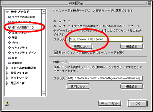 インターネット・エクスプローラーの場合 「初期設定」の Webブラウザの ●ホーム/検索ページ をクリックします。 そうすると、左の様な画面になります。 この画面の赤丸がついているところの アドレス:の部分に、 https://www.1101.com/ と打ち込み、『OK』を押します。