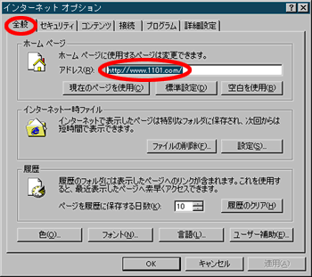 インターネット・エクスプローラーの場合 インターネットオプションの 『全般』をクリックします。 そうすると、左の様な画面になります。 この画面の赤丸がついているところの アドレス:の部分に、 https://www.1101.com/ と打ち込み、『OK』を押します。