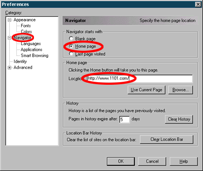 ネットスケープ・ナビゲーターの場合 ウインドウには、「設定」(Preferences)の Navigatorをクリックすると、 左の様な画面になります。 この画面の赤丸がついているところの アドレス:(Location)の部分に、 https://www.1101.com/ と打ち込み、『OK』を押します。