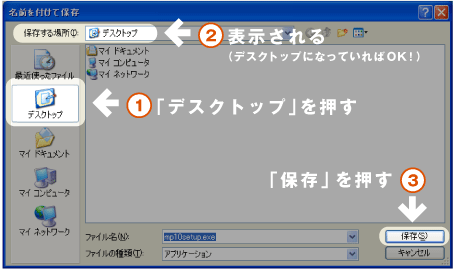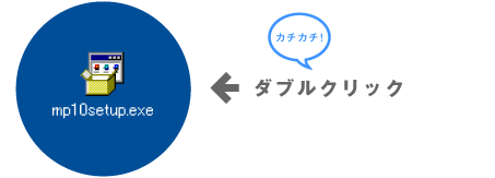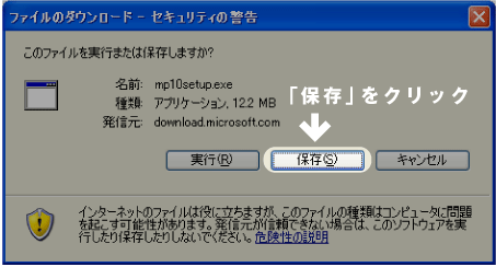 ダウンロードしたファイルをダブルクリックして、 WindowsMediaPlayerを お使いのパソコンにインストールします。 さきほどのダウンロードでデスクトップに保存したファイルを ダブルクリックします。 あとは、画面の指示にそって進んでください。 ![]()