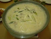 で、材料ですが、上にもかきましたが、 「薬味醤油」と全く同じです。これに塩が加わります。 まず、料理のならいに従って、甘みから加えていきます。 砂糖は、お好みですが、多くても味は崩れません。 そこに、おろしニンニク、ショウガを加えます。 これは、上同様、少量です。特にショウガはほんの少量で、 いれなくてもかまわないくらいです。 ここに、唐辛子、いりゴマ、刻みネギを加えます。 本当は、パウダー唐辛子、 中引き(もしくは荒びき)唐辛子の2種類を使うのですが、 中引き(もしくは荒びき)唐辛子だけでいいでしょう。 分量は、上のタレ同様、「力量」に応じてです。 ただ、この段階で入れる量を決めておかないと、 塩加減が決まらなくなってしまう (辛みと塩味は、相乗効果があるので)ので、 後で付け足さないという覚悟が必要です。 この後、塩と醤油で塩味をつけます。 塩味は主に、塩の役割で、醤油は香り付けと考えた方が いいでしょう。 醤油は、おつけものにちょっと垂らす感じで使う方が いいと思います。 甘み、塩味ともOKとなったら、最後にごま油をまぶします。 このときは、サラダのドレッシングな感じです。 本場韓国では、以外とあっさり(=あまりかけない) としていますが、ボクは結構ベットリとするくらい 入れてしまいます。好みです。 こんな感じです。 そうそう、唐辛子といりゴマだけは 韓国産がいいと思います。 案外、そんなことが微妙な「ズレ」 になってしまうんですよね。 ======================================== 確かに、日本の京料理とかフレンチのように 繊細なお料理ってのとはちょっと違う。 いや、どちらかといえば豪快ですね。 けれど、同じ調味料の中でも、 それぞれの食材に合うように、ものすごく、 計算されてるじゃありませんか。 森川さんは手慣れた感じで、 何気なく調味料をササッと混ぜてたけれど アバウトなわけじゃなかったんですね。 わたしったら、横にいて何見てたのかしら。 かわいらしいキャラクターを次々と生み出している方とは 思えないほどの森川さんの筋肉質な太い腕。 その筋肉が調味料を掴むたびにムキムキ。 ステキ〜!! ああ、そういえば、 腕ばっかり見てたかもな。 男の料理、もちろん計量なんてしない手掴みだけど、 長年のカンがなせるワザなんでしょうか。 あの、手際よい中で、微量な調味料の掛け算が 緻密に行われていたんだわよ。 それゆえに、使う食材・調味料すべての香りや味が 強くても、それぞれがぶつかり合うことなく、 うまく調和してるんですよね。 それぞれがおのおのの香りや味を主張しつつも、 嫌みじゃない。 辛さやニンニクは、素材の味を消すのではなくて 素材と相まって、おいしさを倍増させる ってわけなのですわ。 韓国料理って、やっぱりすごいよ。 さあ、森川さんに教えていただいた「薬味醤油」。 これひとつ基本とコツを覚えておくと、 あとはお好みで調味料の量を調節すれば いろいろ応用でるんですよ。さっそくわたしは ・お豆腐にかけたり ・サラダ菜、キュウリ、ワカメのサラダにかけたり ・牛肉のたたきをつけたりしてみました。 なんにでもおいしい!! では、今回習った韓国調味料でわたしもひとつ。 『韓国風わかめスープ』 沸騰させたお湯にユッスを入れて溶かし、 わかめを入れ、いりゴマ、白髪ネギを散らすだけ。 むちゃくちゃインスタント。でもおいしいよ。 ご家庭で焼き肉の日の付け合わせなどにグーです。 韓国産のユッスといりゴマ、 この2つお家に常備しとくと便利。 森川さんのように、分量の緻密な計算はできなくても、 なんとなく韓国風にはなったよ。 サッカーのワールドカップで、 「韓国の選手の持久力ってすご〜い」 って思いませんでした? あのパワーの源は韓国料理にあるんだな、やっぱり。 それから韓国の人ってほんとお肌がきれい。 韓国旅行以来、わたしは、高麗人参せっけんを 愛用してます。 敏感肌なんだけど、これはいけてるよ。 いやいや、でも韓国の人は 体の中からきれいにしてる感じだよね。 お肉いっぱい食べるのと同時に お野菜もたくさん食べてるし、 なにより、辛いもの食べて新陳代謝がいいんだろうなぁ。 せっかく、森川さんに教えていただいたんだし、 わたしも、もっと韓国料理食べて、きれいを目指そう。 シェイシェイ・・・違った。 カムサムニダ! |