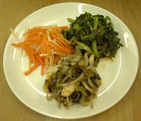 で、(きっと)肝心な分量なのですが、 いつも手を使っているので、よくわかりません。 すみません。 ただ、醤油以外はどれもほんの少量です。 特に、ニンニク、ショウガは火を入れない分、 においがたってしまいますので、 量は加減した方がいいと思います。 逆に唐辛子は、自分、もしくは食べる相手の 「力量」にあわせて、いっぱい入れても味が崩れません。 「薬味酢醤油」は、これに少量の「酢」 (米酢がいいでしょう)を加えます。 ちょっと「酢」がはいっているかな、 くらいの感じがよいと思います。 この場合は、「薬味醤油」より砂糖の量を やや増やした方がいいかもしれません。 2、各種ナムルの調味料。 ナムルは、日本でいえば「おひたし」です。 関西なんかでは、ゆでた後、醤油をたらすのではなく、 濃いめのだしをたらします (ばあいによっては、それにひたす)よね。 それと同じ感覚です。 おひたしでも物足りないので、ごま油や唐辛子を加える、 そんなイメージです。
