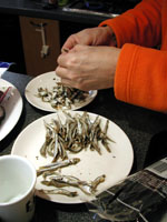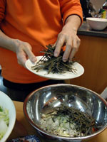 森川さん流・カンタン白菜キムチの作り方 ★前日に塩漬けしておいた白菜は、 水洗いして塩気を抜いて、その後よく 水気をきっておく。 ![]() <材料 4〜6人分> 白菜×1玉 ダイコン×1本 ニラ×1/2束、 セリ×1/2束 ネギ×1/3束 本唐辛子×カップ1杯 ショウガ、ニンニク×各1かけ リンゴ1個 塩、砂糖 塩辛×適当(イカ、オキアミ) いか×1ぱい(具用) ごま、松の実×適当 昆布×適当(だし用と、具用) 煮干し×適当(だし用) 煮干しエキス(あれば) など <手順> 下準備……煮干しの出しをつくる ・頭と腹をとった煮干しと昆布で出しをとる。 かなり濃い(半分くらいに煮詰まるくらいまで) 出しをとる。 ※面倒な人は、韓国食材の店で「煮干しエキス」と いうのが売っているので、これを使うといい。
