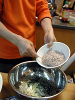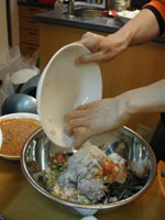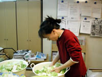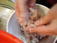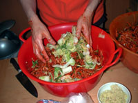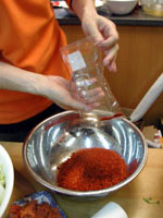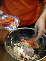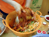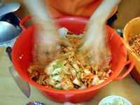 1.具を切る! ・ダイコン、ニンジンを長さ3〜5cm、 マッチ棒くらいの太さ位に切る。 ![]() ![]() ・ニラ、セリ、昆布を3cmくらいに、ザクザク切る。 ・ネギはみじん切りにする。 ・ショウガ、ニンニク、リンゴは、すりおろす。 ※リンゴは辛みを抑えてくれるので、 辛いのが苦手な人は多めにしてもいい。 リンゴの代わりにナシでもいい。 ・(オキ)アミの姿が気になる人は、細かくちぎる。 (そっちのほうが気色悪いかも) ![]() ・塩から、いかも小さく刻んでおく。 2.唐辛子ペーストをつくる。 ・唐辛子の中に、煮干しの出しを入れ、 どろどろくらいのペーストにする。 ・砂糖、塩を加える。 ※辛いのが苦手な人は、砂糖の代わりに蜂蜜を入れたり、 砂糖の量を増やすといい。 ※キムチは、実はあまり塩分が高い漬け物じゃ ないので、日本の漬け物の感覚で、 あまり塩辛くならないように注意する。 ・ ネギ、昆布、アミ、塩辛、イカなどを加える。 ![]() ![]() ※冷蔵庫に残ったタラコとか、めんたいことか、 アンチョビペーストとか、塩辛とか、 加えてみるのもいい(自己責任!) ダイニング部で加えたのは、めんたいこをほぐしたもの。 ![]() ・ごま、松の実をくわえる。 ![]() ・深い味を出すために、煮干しエキスを加える。 ![]() ・混ぜ合わせる。 ・十分に混じったら、1の具を加えさらに混ぜ合わせる。 ※あまり力を入れて混ぜ合わせると、 ニラやネギから汁がでて苦くなるので、 ざっくり混ぜ合わせる。 ・ここで、ちょっと、白菜にペーストをのせてみて 試食して、塩加減などを調整する。 3.白菜と合わせる。 ・2のキムチペーストと先に塩漬けした白菜を合わせる。 ・ダイニング部では、乳酸発酵をすすめるために、 ここで市販の白菜キムチを加えた。 ・これで完成! 4.保存する場合は、空気が入らないように、 密閉して保存する。