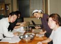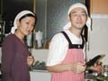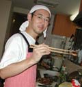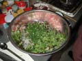中継開始。 テーブルの上は、 きのう「タイ食材」のおみせでかい出した野菜たち。 ・シャンツァイ(コリアンダー) ・ディル ・レモングラス ・スイートバジル ・しょうが などなど。 シェフ・武井と野菜たち。