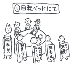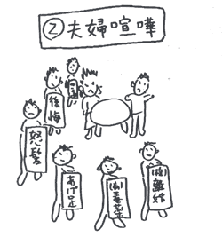 ちゃぶ台を前に対峙した夫婦のまわりを回った。