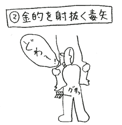 女性の放った毒矢は、見事に弟子の金的を射抜いた。 |