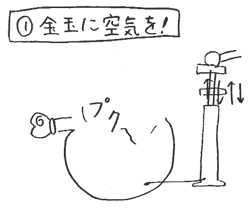 素早く、自転車用空気入れの針を金玉に刺し、