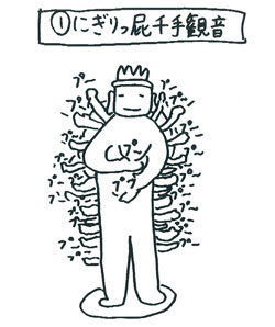 にぎりっ屁千手観音は、千本の手にのせた実を、