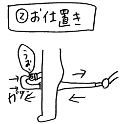 柄で生のちんちんを痛めつけるのである。