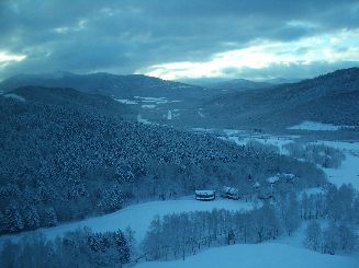 | 原野の天狗 ひと月前はまだ紅葉の真っ最中だった。 勇払原野が深まるにつれて、 特急<おおぞら>の窓の外の まっ白い原野に斜めの雪が吹いている。 ヒトの姿なぞ見えなかった。 人家も全くなくなって、 雪の上に掌みたいな形でのぞいている クマザサの群れが忙しなく手首を回転させて、 雪との闘いをしているようだ。 無人駅の<トマム>もすでに分厚い雪におおわれていて、 オレひとりだけ降ろした急行列車は雪煙をあげて、 釧路方面に向かってトンネルに消えていった。 シーズンになれば賑わうプラットホームも、 今はまだ物音ひとつしない。 立ちつくして無音の景色を眺める。 全てを真っ白く塗りつぶした景色の中に、 <スパイラルな凍り>を描き直していた。 氷点下一〇度にはなっているのだろう。 ダウンコートが膨れた。 柵の外でエンジン音が雪に吸い取られた4WDが 一台だけ震えていたが、 脇で直立していた<落下サン>がオレと目が合うと、 両腕を身体にピタリとつけた上体を軽く前傾した。 「昨日からやっと降りはじめました」 「気温はどんな具合だべか」 「零度を往ったり来たりですが、そろそろ大丈夫です」 <落下サン>の受け答えは、 北海道弁には珍しくキビキビしている。 滑る雪の上を慣れた運転でかわす。 「紅葉の景色の時に決めた <スパイラルの凍り>の場所を変更したくなった。 イイべさ」 「ハイ、何処へでも案内します」 直径二メートルのマンホールを作る型枠を運び込み、 満タンにした六トンちかい水を凍らせるヒカリの塔だ。 大気の気温だけを味方にした透明で 巨きなヒカリのタワーは、 二、三ヶ月でまた春のヒカリで自然に戻っていく その儚いジカンまでもが今回のゲージツなのである。 ![]() ![]() ![]() 増大させたイメージをメモしたり、 シミュレーションしたり学習してきた頭蓋を、 いよいよ勇払原野に運んでの実践である。 雪の上に<気>を飛ばしてポイントを決めた。 この始まりになるポイントに、 <落下サン>が長いポールを突き刺した。 まだ雪が降りしきる六メートル上空を見上げ、 作業の手順を頭蓋内に辿る。 『これはサハラ砂漠やモンゴル草原でのゲージツ行より ヘビーになるかもしれないゾ』 オレの強い願いの味方は、 大気と強力に結集したヒトのチカラだ。 しかもここは極寒の地といえジャパンじゃないか。 なんとかなるわい。 雪に覆われた荒野に飲み屋なぞ見当たらなかった。 「ヨシッ、落下サン。場所は決定したし、 景気ずけにいっぱいヤルかい」 「今晩やっているのは一軒だけです」 という。この広い荒野の出身で、 落下傘部隊の精鋭になった彼は 先頭で適地に落下して敵情視察、 後続部隊の安全な落下場所を確保して 連絡をとる任務だったらしい。 もう引退して時間が経つらしいが、 落ち着いた穏和な顔が ヒトとの応対の時に垣間見せる 強靱な気配が頼もしい。 ショーチューの酔いにまかせて、ゲージツを戯れる。 雪の上での<御祓い>も大切だなと言うと、 彼はイイ神主がいますと言う。 「じゃあ獅子舞も舞ってもらうかい」 「天狗はどうですか」 彼も少し雄弁になっていた。 「森の中から跳んでくる天狗なんてのはイイべや。 ハクいべさ」 「実は自分の本家の叔父さんが天狗をやっているんです」 と言う。しかしその天狗は酒が入ると しつこくなって厄介らしいのだ。 「そんな厄介と関わっているジカンはないから、 今回は普通の天狗にしようや」 「別のイイ天狗もいますから大丈夫です」 北海道の原野にはまだ天狗がいるのだろう。 安いショーチューとホッケの開き。 脂がのって見離れのイイこの魚を喰っていると、 オレが育った北のメモリーが渦を巻く。 オレのガキの頃、本家に集まることになった 暮れや正月は嫌な思い出だ。 襖一枚向こうの広間では大人等が酒を呑んでいて、 こっちの小部屋では本家の子供に 都合良くルールを変更される つまらないゲームに付き合わされていた。 そのうち襖の向こうから大人の言い争いになり 泣き声がはじまり、なだめる声。 耐えかねたオンナ親達が甲高い声で叫びだし、 まるで鶏小屋にイタチが忍び込んだ騒ぎだ。 オレはただひたすら怯えていたものだ。 そこに決まって襖が倒れてきて、 酔って演芸をやっていたらしい女モノの着物で 顔を真っ赤にした叔父さんが飛んでくるのである。 叔父さんではなく天狗になってしまった 恐ろしい光景だった。 落下サンも同じような経験をしていたのだった。 安いショーチューに愉快な気分になっていた。 外は猛烈にしばれて、酔いもたちまち醒めた。 準備に東京に戻る。 トマム駅で列車を待っているのは やっぱりオレ独りだった。 数時間前が、別世界のような東京で準備だ。 |