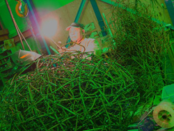 | セキレイ糞をひる 山岳地帯の梢もうっすらと霞んでいる。 オレの林では、 サクラのツボミが膨らみはじめたばかりで、 ウメのツボミは昨日みっつ破裂した。 昨夜の吸いさしのCOHIBAに火をつけ、 シャッター前で日向ぼっこだ。 うららかな煙越しに、 ゴールデン・ウィーク過ぎまで 雪の消えない甲斐嶽の稜線が、 クッキリとそびえている。 二週間もすれば<神代桜>も 樹齢にムチ打ち可憐な薄紅を爆発させると、 善男善女を満載した観光バスが往き来する。 彼等は老残サクラに我が身を移し、 感嘆の声で見上げた挙げ句に、 根元を土を踏み殺してしまう。 何年か前に歩くコースを少し湾曲させたらしい。 今年も四月一〇日前後にはこの辺りの道も 賑やかになるんだろう。 シャッターの中は床を突き破り、 絡み合い逆さまに伸び続ける植物の根のような スクラップが陣取っている。 巨大な植物退治のように、 グニャグニャの異形鉄筋を 朝から一本一本バーナーで断りだしては、 ハンマーで叩き延ばし溶接して 新しいカタチに変換しているのだ。 この作業でマスクの遮光硝子も 紫外線スパークから完全には防御しきれていない。 晴れたシャッター前の地べたにゴザを敷き、 見慣れた甲斐嶽に 少しやられちまった目玉を遊ばしていた。 涙が流れて止まらないのは、 ただ灼けた網膜にヒカリが刺さるためだ。 目を閉じては風が運んでくる寂音に聴き入る。 このところよく見掛けるセキレイが 長い尻尾を振りながら、 ウメの下の枯草を掻き分け歩いていた。 「そろそろムシも湧き出してきたかい」 と声をかけてしまった。 山籠もりの普段に、呟いてるやもと疑っていた 独り言の現場を、とうとう捕まえたのだ。 尻尾の忙しない上下運動の上げた合間に、 糞をひびり出したセキレイは、 「ぼちぼちでんな」 というような顔でオレの方を見たが、 すぐにその向こうの枯れた繁みに ムシを捜しに行ったから、 オレはまた独り言のような屁をこいた。 セキレイは枯草の景色をしみじみ読んだりせず、 餌になるムシさえ感じ取ればつついて喰うだけなのだ。 さっき通り過ぎた犬もそうだろうし、 夜中にゴミ箱を漁ってスカを喰ったムササビも景 色なぞを観たりはしてない。 見ているのはいつも餌になるモノだけだ。 そういえば最近姿を見せなくなったカラスは、 オレの存在がけむたいか餌の無いことを 見切ってしまったらしい。 小学校六年の校外写生の時に、 <室蘭岳>を描かされた。 担任は親指と人差し指でL字型を作り 直角に合わせた四角形を目の前にかざしながら、 「こうして切り取った景色を描きなさい」と言った。 きっと遠近法について教えてくれたのだろうが、 オレはその格好が何だか恥ずかしかったから、 望遠鏡のように左掌を筒状にして目に当てた。 見慣れた室蘭岳を覗くと、 ちっぽけな山が暗くクッキリして見えた。 後になって検査でひどい乱視が発覚したのだ。 オレはとりあえず室蘭岳をさっさと描き終えた。 このままではなんだかつまらない絵に思え、 岳に遊びに行った時に見て覚えていたコクワの実や、 軍艦バッタやエリヤの馬鹿、 ユートピア牧場や地蔵さんや、 首つりの樹や、牛や馬などでその上を埋め尽くした。 ムロラン岳をゴチャゴチャになったけど、 変な仕草で景色を観察せずにすんで大満足だった。 懐かしくもない束の間、 ココロの歪んだ遠景とダブっていたのだ。 ![]() 急に冷えてきて甲斐嶽がたちまち雲に覆われた。 灼けた目の前が突然、 花びらのような雪が渦を巻き 景色は粉々になったようだった。 腕枕で転がっている場合ではない。 夜鷹のようにゴザをクルクル巻いて オレもFACTORYに退散した。 この時期の山岳気象は気まぐれなのだ。 水平や垂直をなした一本一本の異形鉄筋が空間を区切り、 異なった弧の群れがそれぞれと交わり 他の鉄筋と繋ってきた。 雪の乱舞も終わってしまったようだし、 残っている鉄筋の根っこも少なくなっていた。 もう溶接の変換作業もそろそろお終いに近づいた。 「あっ、大シゴトがまだあったわい」 スクラップの異形鉄筋の楕円球を <白>で隠蔽する作業が残っている。 戒めの独り言だった。 独り言はもう一人のオレなのだ。 |