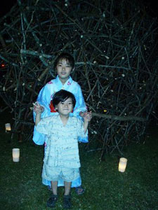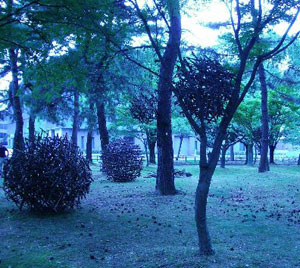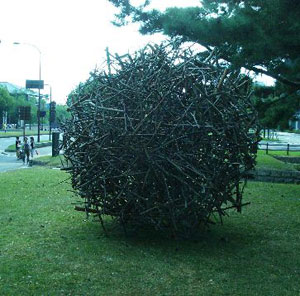 | 美しい数列 慌ただしい旅支度の途中で、 二の腕の内側に、ボールペンで数字の列を書き込んだ。 『自然の美しさは<対数>だけでは 説明がつかないことを示していて、 万が一、ヒマなおりに 次の数字の関係を考えてみませんか』 プロフェッサー・WARAWAIからの お誘いメールだった。 とっさに直感もなにも働かず、関係が分からないまま 旅の<お呪い>のように、腕に刻んで <NARABALL>の仕上げに向かったのだった。 集めた間伐材は約六トンになった。 ひと月前から奈良の山岳地帯、 上北山村や、万葉の森、大宇陀など、 それぞれの集落で、細かい部分を払った雑木の枝を、 ハッカーを使い結束線で繋ぎ合わせ、 少しずつ直径を変えた円盤を作り、 それを重ねては大小六個の球体に組み上げてきたのだ。 徐々に準備をしてきて、 二メートル径と一メートル径の五個は 何とか間に合いそうだったが、 奈良の都へ運び込む前日になって問題が発生した。 覚悟はしているが不測の事態である。 県境の山奥でひとり奮闘していたピッカリ君から、 三メートルのモノは自重で崩れて なかなかカタチにならないとの連絡だ。 枝のまま現場に運んでみんなで組み立てることにした。 翌早朝、すっかりハッカー使いがうまくなった KORYA君はじめ、 プロジェクト・スタッフが文化会館の森に集合。 ![]() ![]() スタッフといっても 何人かリクルートした役人も加え十人足らずだ。 それでも三メートルのBALLを組み揚げ、 他のボールも次々と設置し終わった。 徹夜も覚悟していたが夕方には完了した。 <燈華会>で賑わう文化会館の人工の森に降り立った <NARABALL>は、つかの間、<燈火>と戯れた。 <BALL#1>に マツボックリを飾って遊んでいる弟を、 やさしく見ている浴衣の少女は美しい。 2006第3弾<NARABALL> #1、#2、#3、#4、#5、#6は またあちこちの山岳の森に戻っていき、 カボチャや瓜やアケビの蔓に覆われ たわわに実らせるBALLになるのである。 森を移動し変幻するオブジェは、 やがて冬のスノウボールになり、 グリーンボールになる春を待つのだろう。 猛暑での制作も何とか終わり、 KORYA君が持ってきた西瓜を喰い、 打ち上げの酒も控えめにして宿に戻る。 袖口を捲って美しい関係を探ろうと思ったあの数列が、 肌にわずかな赤い筆跡だけを残して 消えているではないか。 しかもアキレス腱の辺りに痛みが走っていた。 間伐材を集めに入った山岳で、 キコリさんとの雑談してるうちに、 自分も激痛で通うという <奈良で唯一の痛風専門医>を紹介されたのも 何かの<縁>だった。 二〇年前の厄年に激痛の発作で救急病院に運ばれて以来、 モンゴル草原、サハラ砂漠、フィンランドの湖畔、 カナダ・インディアンの居留地などでの ゲージツ行の仕上げは、いつも激痛だった。 その都度、<痛み止め>の錠剤で 凌いできたオレだったが、ついに年貢の納め時か。 さっそくDR.樋上に会いに行くことにした。 医者にかかることも稀だったが、 <痛風>の専門医というのも初めてである。 若いドクトルだったが<痛風治療>に対する 強い意志を放っていた。 生真面目な顔での質問は、オレの不養生を指摘し それを、オレの口から答えさせるのである。 薬でも出してもらえたらと思っている オレを見透かすように、 「このままだと死にまっせぇ!」と叫んだ。 「しかも苦しんでぇ」。 もう十数年経つが、心臓病での入院を見舞ったおりに、 「いつ死んでもいいと覚悟はしていても、 いざ心臓の発作が始まれば 『助けてくれぇ!』と医者にすがってしまう 自分が情けない」と呟いていた 深沢七郎親方を思いだした。 親方の最後は、ラブミー農場のど真ん中に置いた 床屋の椅子の上で、 日向ぼっこでを楽しみながら睡るように逝った。 見事な消滅だった。 ココロの奥底に潜むショードーと、 世界にすでにあって未だ姿を見せない 美しいモノとは何かをもう少し探るオレには、 痛風の激痛なぞに翻弄されているジカンはない。 ドクトルの言いつけに従い、 水も食餌も制限しての再検査を受けた。 結果が出る前に次の旅にむかった。 ![]() ホームページの内容が大充実にリニューアル。 充実した作品群をお楽しみください。 http://www.kuma-3.com/ |