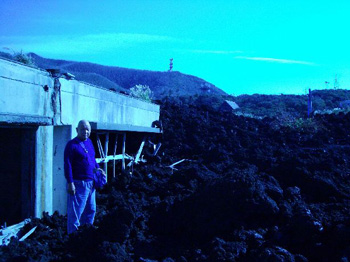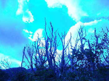 | サイト・スペシフィック <火山フォーラム二〇〇六>が開催された三宅島は、 はるか洋上にある東京都に所属する三宅村である。 <サルビア丸>は夜一〇時半タケシバ桟橋を出港。 翌朝五時の到着予定だ。 少々吹く風は予報では<木枯らし一号>の前触れか。 レインボーブリッジを潜ってもまだ広い東京湾内は 穏やかな航海だった。 しかし湾から外海に出ると、風も強まり大きな <サルビア丸>も左右にピッチングを始め、 船室の丸窓の外はすでに沿岸の灯りもいっさい無い 暗黒の海になっていた。 風裏になる島の反対側の三池港に変更して接岸。 <天気晴朗なれど浪高かし>である。 講演が始まる前に平野村長の車で島中を案内された。 火口付近まで登っていく路の両側は、 ガスで白く立ち枯れた木々。 溶岩流で覆われ砂漠のようになった元牧草地と、 真っ青に高い空とのコントラストは、 幾臆年前の始原的な景色に違いない。 枯れたままで立ちつくす枝は風や雨ですぐに折れる。 枯れ枝のように白く乾燥した牛の骨が散らばっている。 すぐ脇に小さな草の芽が溶岩の隙間から出ていた。 ![]() ![]() 風と砂がぶつかり合う音しかなかった サハラ砂漠で過ごしたジカンを想いうかべていたのだが、 圧倒的なマグマのチカラの痕跡には、 風に混じって時おり名も知らない鳥の声が 混じって聞こえている。 こんな風景のなかでただ<耳>と<目>だけになって 過ごす<今>。 雄山に降り積もった火山灰が雨で泥流となり、 鳥居の頭だけを残して埋まってしまった椎取神社。 活火山の<サイト・スペシフィック>を浮遊した。 富士火山帯に所属している三宅島は火山の博物館だが、 列島自体が火山帯の上に乗っかっているのだ。 ![]() ホームページの内容が大充実にリニューアル。 充実した作品群をお楽しみください。 http://www.kuma-3.com/ |