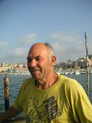 色の褪めた紫のシャツを着た彼はすでに舟にいた。