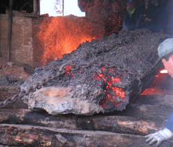 棒を差し込んで窯を崩していく。