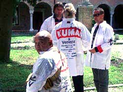 | ヴェネチア浮遊 その2 司教、作業服、PAOLO主催のランチ。 半年前、ミラノ個展が終わって帰国したオレのPCに、 PAOLOから 「来年六月から再びヴェネチアでやってみないか」 のメールが入って、 水浸しのヴェネチアにひとり引っ返し、 待ち合わせたPAOLOと助手のJENMAが待っている フランチェスコ修道教会を訪ねた。 案内された古い煉瓦の教会は薄暗く、 石棺を敷き詰めた回廊の広い中庭に出て、 もの凄い速度で千切れる雲で いつまでも充たされていた四角い空を、 幾百年も前の死を詰めた石の箱に座って 弱いヒカリを眺めていたオレの頭蓋内に、 この永いジカン四角く切り取られて来たヒカリを ゲージツ<LA LUCE CIRCOLANTE>は、 すでにデッサンされていた。 「ここ全部をお前に用意出来る最高の場所だと思う」 とPAOLOが言った。 「よしっ、決まりだ」 オレは契約書にサインをすると 後ろで大柄のロベルト司教も大きな白い犬と微笑んでいた。 「ゲージツは凄いけど、どうしてそんな血みどろになるの?」 エージェントの早苗女史も心配したが、 「生きる証拠さ」 と気張った半年間、 十トンのオブジェを創る事はどうってこともないが 相変わらずゼニとの闘いは続き身ゼニは底をついた。 心強い援軍、高知の技研製作所の社長や <アンテプリマ>の荻野兄貴の手が届いて、 十六日ヴェネチアは初夏の空気。TSUCHYが迎えにきた。 ![]() オレがデザインした作業服を抱えて、 朝十一時アパートから歩いて一〇分ほどにある フランチェスコ教会に向かう。 半年ぶりだ。 PAOLOもJENMAも待っていたが、 ニコニコ迎えてくれた司教のわきに白い犬はいなかった。 「あんなにKUMAになついていたのに、 一月三日に死んだんだ」 穏やかな声で言う。 作業服をみんなに配り 「みんなすぐに着るように」 指示した。 ![]() 教会内は白装束であふれ、 <LA LUCE CIRCOLANTE>の組立や オブジェ設置を手伝ってくれる水上運送会社の三兄弟も、 オレの設計図に従ってさっそく寸法を取り始めた。 「私にもいただけるかな」 司教はどこまでも静かな口調だ。 背の高い彼には3L。 背中にサインをした。 みんなこのデザインが気に入ったようだ。 鐘が鳴り十二時。 「これはこの地方の農家で五百年以上続く製法で造った ワインだ よ。お祝いだからみんなで飲みましょう。 去年取れた葡萄だからまだ熟成してないけど」 司教が運んできたワインをグラスに注いでくれた。 オレはワインのことに詳しくないけど、 頭蓋方面に染みこんでいく土からの濃い液が心地よくて 何杯もお代わりした。 「私はブランドの物は着たことがないけど、 KUMAのサインが入ったこの服が 初めてのブランドだよ。ありがとう」 オレとグラスを合わせた司教は静かに飲んだ。 三兄弟は 「OKだ、任せなさい」 部材の搬入は月曜日からになって少し安心。 兄弟のボートで近くの島に行き、 ニセアカシアの白い花吹雪のなかで PAOLO主催のランチ。 呑む、喰う、大騒ぎが夕方まで続いた。 店の主も客も白装束の背中の<KUMA>を見て 興味を示す。 これはスタッフをオレの頭蓋に引き締める服だが、 ポスター効果もあるわい。ミラノ個展を見たという 客から頼まれ、料理皿に残っていた 烏賊スミでサインした。お返しのグラッパがきた。 オレは完全にアジャパーになっていた。 『今日は土曜日だったか…』 『蔓草のコクピット』 (つるくさのこくぴっと) 篠原勝之著 文芸春秋刊 定価 本体1619円+税 ISBN4-16-320130-0 クマさんの書き下ろし小説集です。 表題作「蔓草のコクピット」ほか 「セントー的ヨクジョー絵画」 「トタンの又三郎」など8編収録。 カバー絵は、クマさん画の 状況劇場ポスターの原画「唐十郎版・風の又三郎」です。 |