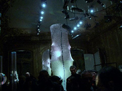 | パリの灯に釦の飛行 隣に座っているエルマーノが、 オレの膝を突いてエッフェル塔を指差した。 暮れはじめたPARISの空に イルミネーションがヒカリのレース編みのようだった。 そしてANTEPRIMAの腕時計を見つめ 「3、2、1…」カウントダウンし、 間を置いてから「あれっ」と呟き眼をあげた。 「どうしたんだ?」 と訊き直すと、彼の指差す先のエッフェル塔が 突然激しく青白いヒカリに フラッシュしはじめるじゃないか。 「スパークリング・シャワーだ!」 塔全体が美しく浮き上がった。 彼はオレにこれを見せたかったのだ。 それを左に眺めながらタクシーが会場の宮殿前に着いた。 鉄門扉が細く開けられた入口で、 屈強なガードマンがチェックしていて 招待状がなければ入れないらしい。 フランス人の美術評論家のドミニク・ステラも、 招待状と身分証明書を照合される厳重さだ。 「KUMA、パスポート持ってきた?」 「手ぶらさ」 「でもKUMAはゲージツ家だから大丈夫」 エルマーノが印刷してある作家のKUMAに 間違いないないことを説明すると 「OK、ムッシュ」。 IZUMIさんはオレの<釦の飛行>に合わせて、 街の店で見つけた貝釦で出来た帽子を載せていた。 さすがにファッションの心遣いが嬉しい。 ドレスアップした人たちでごった返している中を 掻き分け、<釦の飛行>の展示場所まで 彼女を案内しながら誇らしかった。 ![]() ![]() 観るなり 「あっ、素晴らしいわ。おめでとう」 IZUMIさんが眼を輝かせた。 ひとの流れで揺れ、釦から垂れている 色とりどりの糸がなびいていた。 「KUMA、凄いわ。またやったわねぇ」 ドミニクもオレの頬にキスをする。 彼女はミラノMUDIMA個展のキュレーターだ。 もうオレの手から離れてそこに在るオブジェを 他人事のように眺めながらも、オレは満足していた。 あっという間にオブジェの前の二人を カメラマンらが取り囲み、 テレビクルーの取材攻勢である。 一番注目をあびているらしい。 『ゲージツ・ダマシイの底ヂカラのカケラを、 PARISへのオレからのほんのプレゼントさ』 シャンペンのほろ酔いで、独りほくそ笑んでいた。 カケラにしては大きいか…。 『明後日から一般公開らしいが、 大勢のヒト等も心地良くなればイイわい』 大混雑のなか、オレの気はすでに 次の浮遊先にとんでいた。 次々と<釦の飛行>にヒトが集まってきては 笑顔のフランス語を飛ばしてくるのだが、 何のことだかわからない。 マ、賛辞なのだろう。 コトバの主のファッションの大立者たちを、 IZUMIさんが次々に紹介してくれた。 ピエール・カルダンだけは分かった。 ![]() |